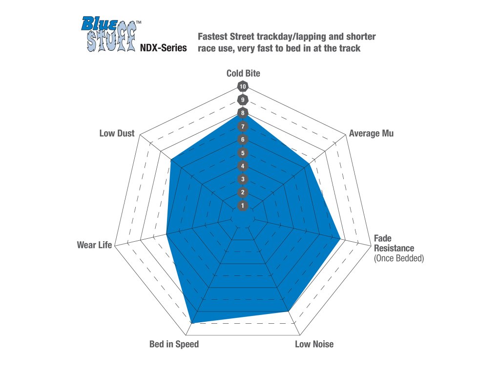 Bluestuff NDX je odporúčaný pre vodičov, ktorí jazdia na okruh vlastným autom bez nutnosti výmeny brzdových platničiek pred cestou domov. Vďaka hladkému modulačnému pocitu na pedáli a výbornej ovládateľnosti pri nízkych teplotách sa stali obľúbenou voľbou aj medzi vodičmi v USA a Ázii.