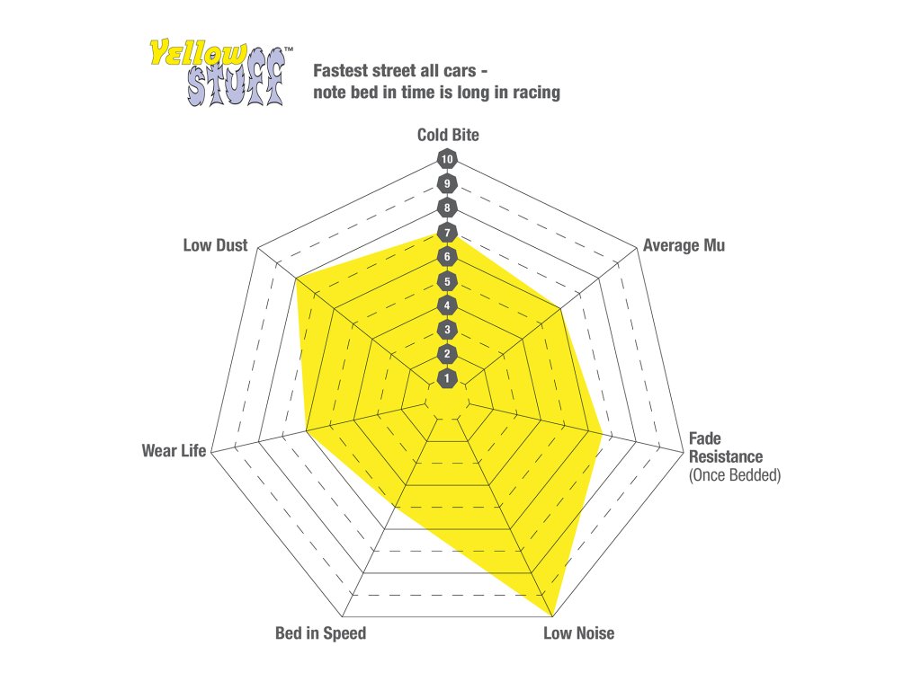 Brzdové doštičky Yellowstuff™ sú navrhnuté tak, aby zvládli extrémne tepelné zaťaženie – až do 550 °C. Ich životnosť závisí od štýlu jazdy a typu vozidla. Zmes je bez obsahu medi, šetrná k životnému prostrediu a zároveň k brzdovým kotúčom.
