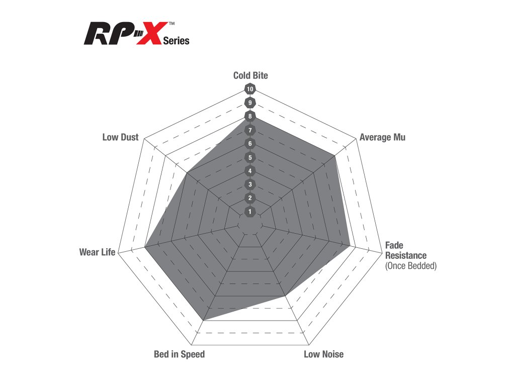 Tieto brzdové dosky sú navrhnuté pre vozidlá s vysokým výkonom a veľkými brzdovými systémami, kde je potrebná maximálna kontrola a stabilita. RP-X™ poskytujú ostrý nástup, ktorý niektorí jazdci preferujú pred progresívnejším charakterom RP-1™. Vďaka tomu sú vhodné pre tých, ktorí vyžadujú maximálnu brzdnú silu bez kompromisov.